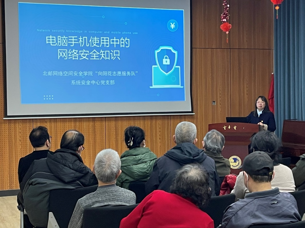 2023年3月1日上午,为深入学习宣传贯彻党的二十大精神,坚定不移贯彻总体国家安全观,更好的增强群众网络安全和个人信息保护意识,澳门银银河4936“向阳花志愿服务队"系统安全中心党支部在老干部活动中心多功能厅,为离退休老同志组织举办了“安全科普”知识讲座的志愿服务活动。