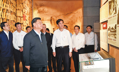 5月20日至22日,中共中央总书记、国家主席、中央军委主席习近平在江西考察,主持召开推动中部地区崛起工作座谈会并发表重要讲话。这是习近平在赣州市于都县中央红军长征出发纪念馆参观,听取有关中央红军长征集结出发历史情况介绍。